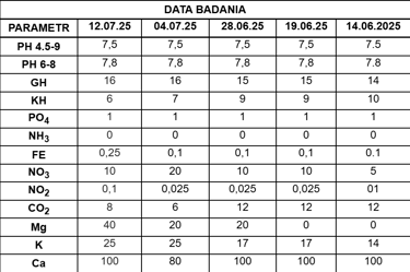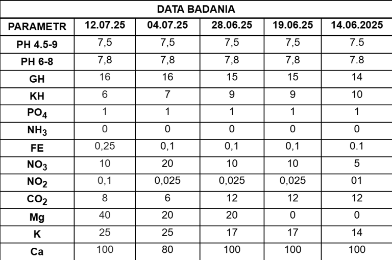 NO3 5–20 mg/L - Dane z tabeli sugerują bardzo mocne wahania z 10 do 20 mg co może być spowodowane przerybieniem i dodatkowym nawożeniem macro.