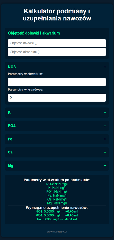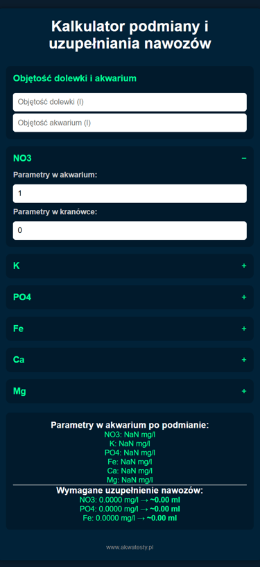 podmiany 30–40% co tydzień (RO + mineralizacja) i uzupełnianie braków zgodnie z kalkulatorem